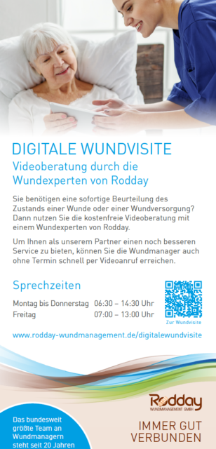 Unsere Experten bieten Ihnen kompetente Beratung zu bestehenden Wunden, die aktuell über einen Wundmanager von Rodday betreut werden. Sie können die Wundmanager ohne Termin hier per Videoanruf erreichen: